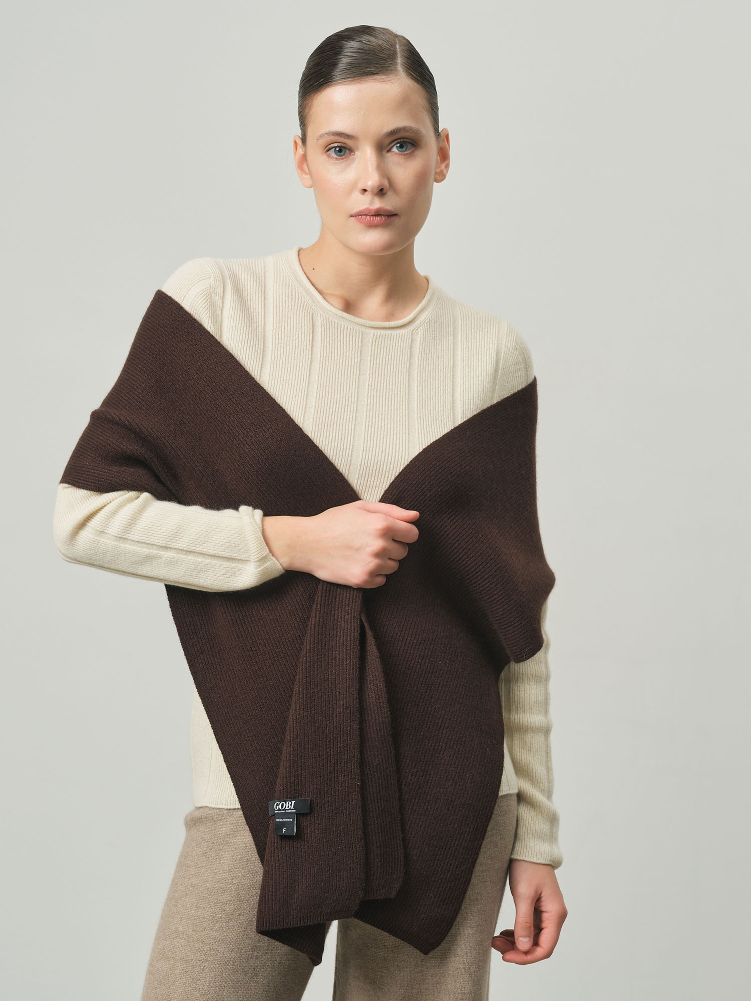 Модель выполнена в классической прямоугольной форме с аккуратной фактурной вязкой в рубчик. Минималистичный дизайн подчёркивает благородную текстуру материала и делает шарф универсальным аксессуаром гардероба.