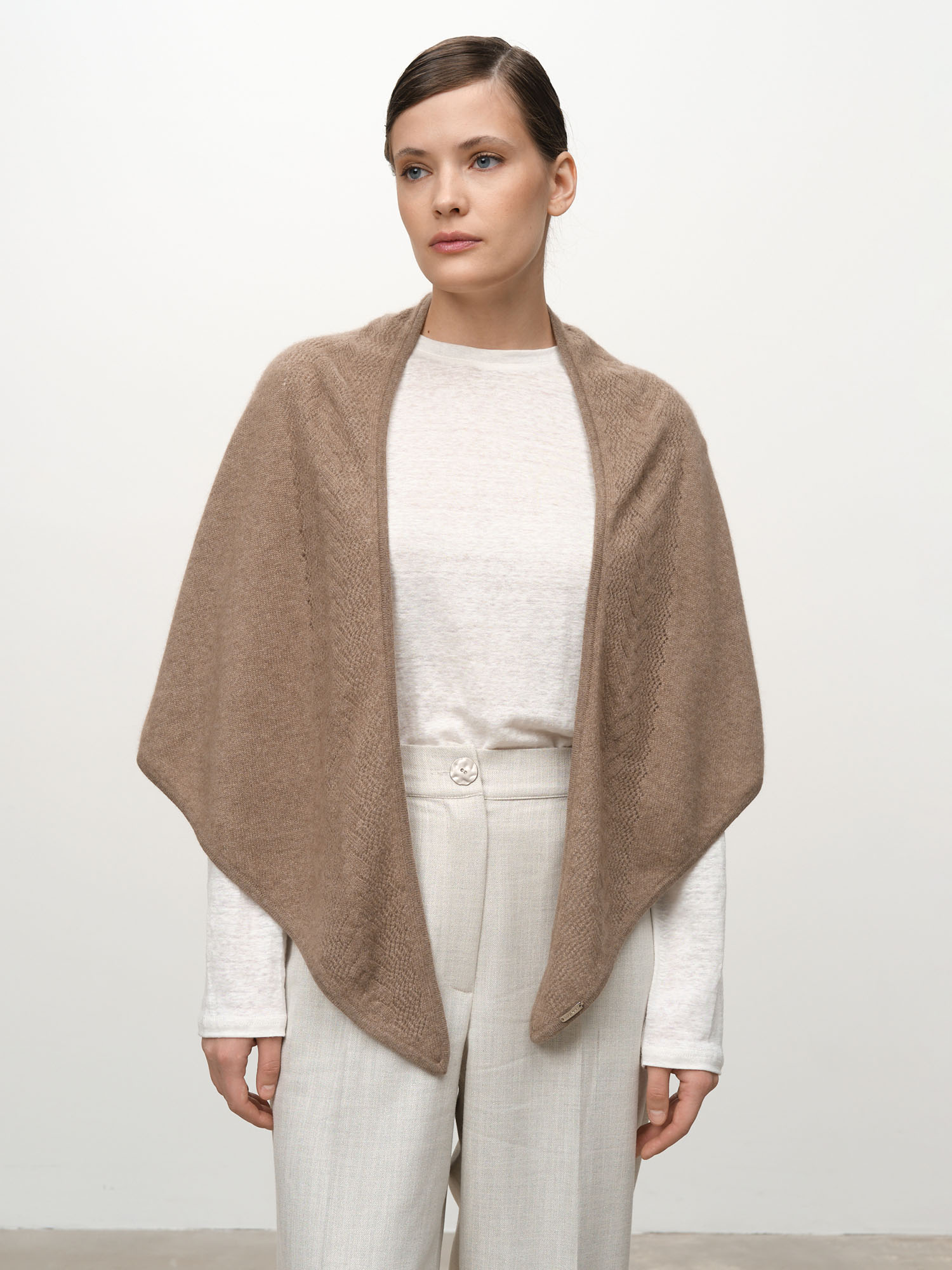 Модель выполнена в аккуратной треугольной форме, которая позволяет красиво драпировать аксессуар. Минималистичный дизайн подчёркивает благородную фактуру кашемира и делает изделие универсальным элементом гардероба.