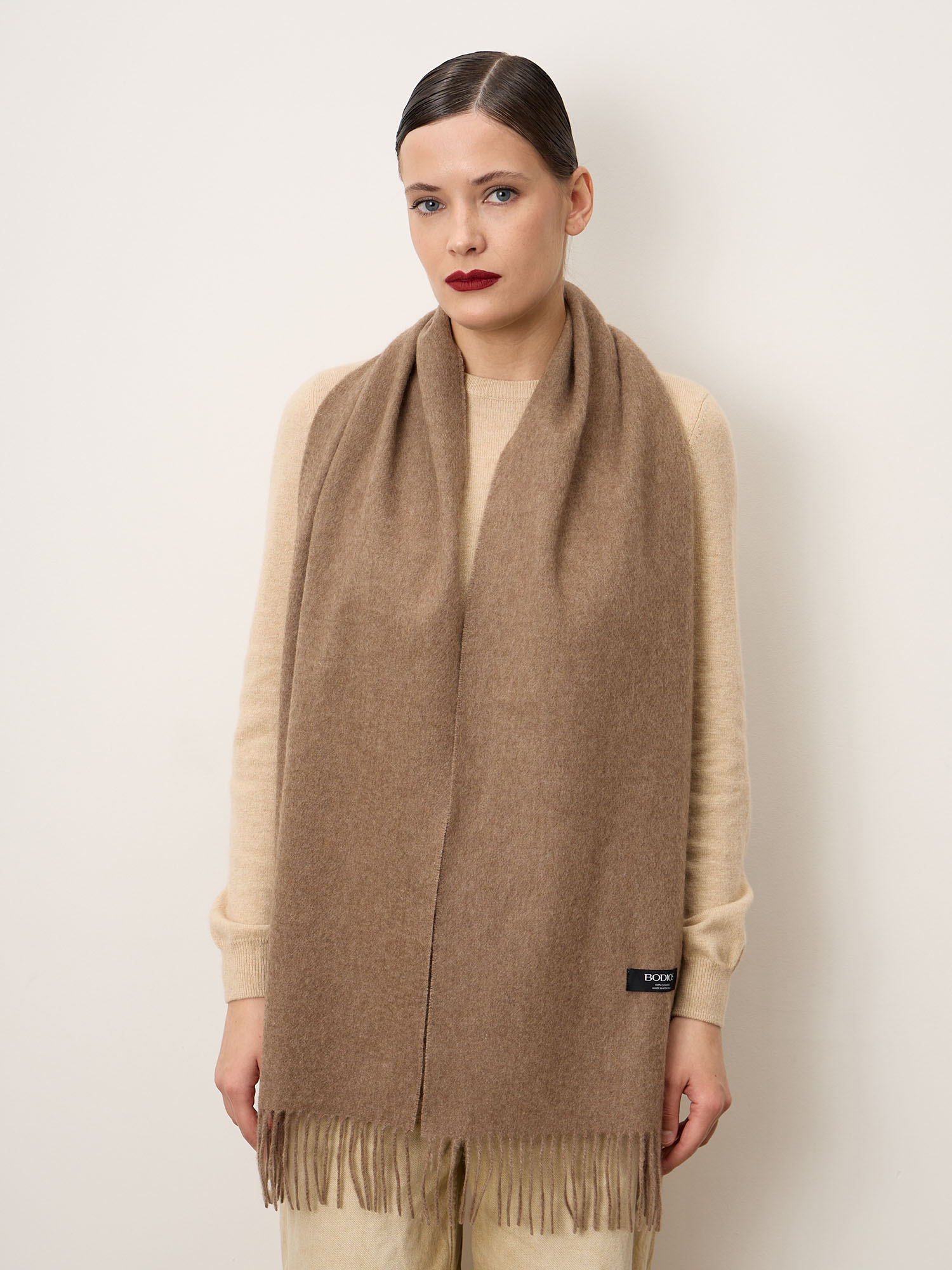 Классический прямоугольный формат с аккуратной отделкой и деликатной бахромой по краям. Лаконичный дизайн без лишнего декора делает шарф универсальным и актуальным вне времени. Оптимальная длина позволяет носить его свободно на плечах или оборачивать вокруг шеи.