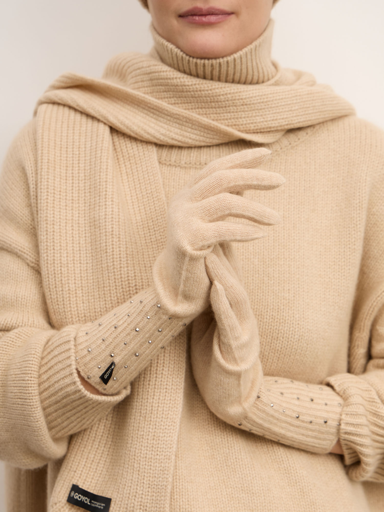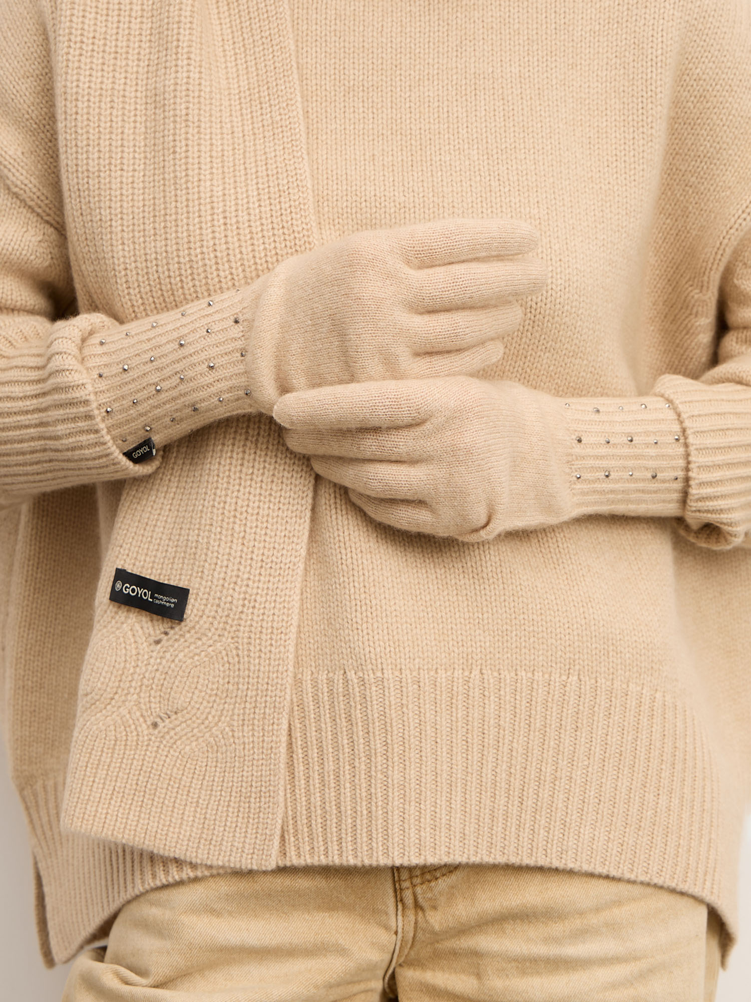 Бежевый оттенок подчеркивает мягкость и универсальность изделия, а блеск страз добавляет образу утончённости. Легко сочетается с любой верхней одеждой.