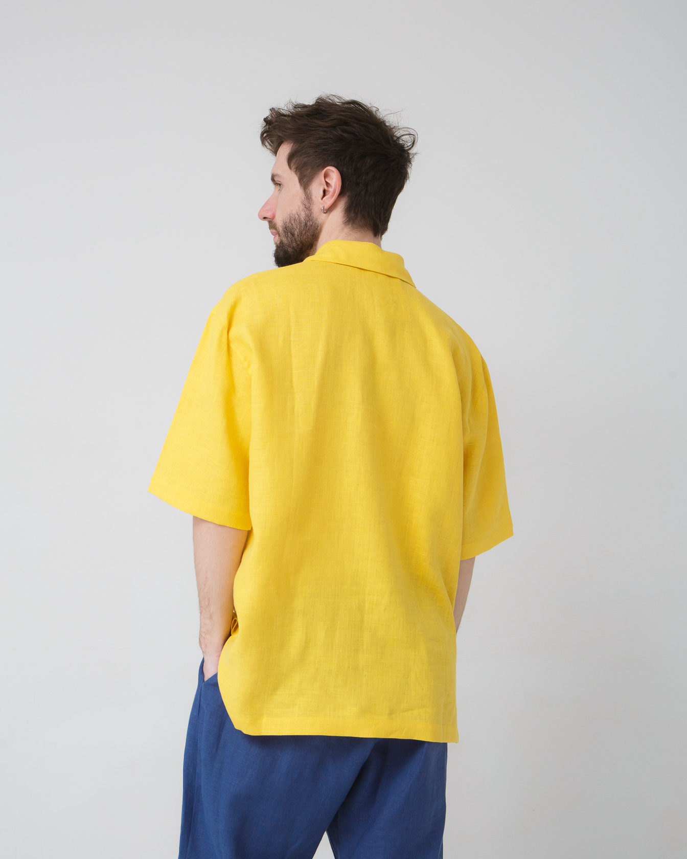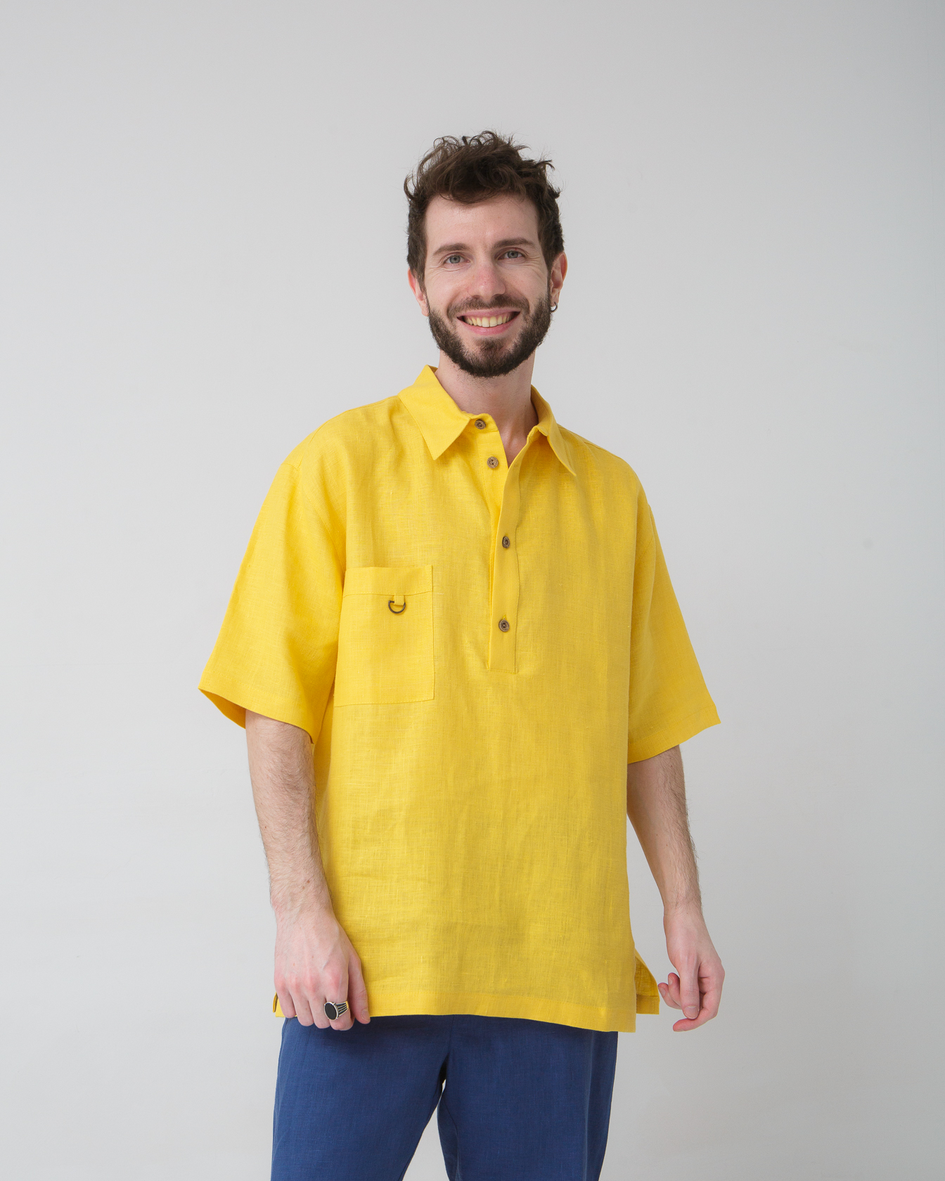Мужская льняная рубашка-поло в желтом оттенке — яркая и комфортная модель для летнего гардероба. Свободный крой и натуральная ткань создают ощущение легкости и свободы, а современный дизайн делает образ стильным и непринужденным. Идеальный выбор для отдыха, прогулок и повседневной носки.