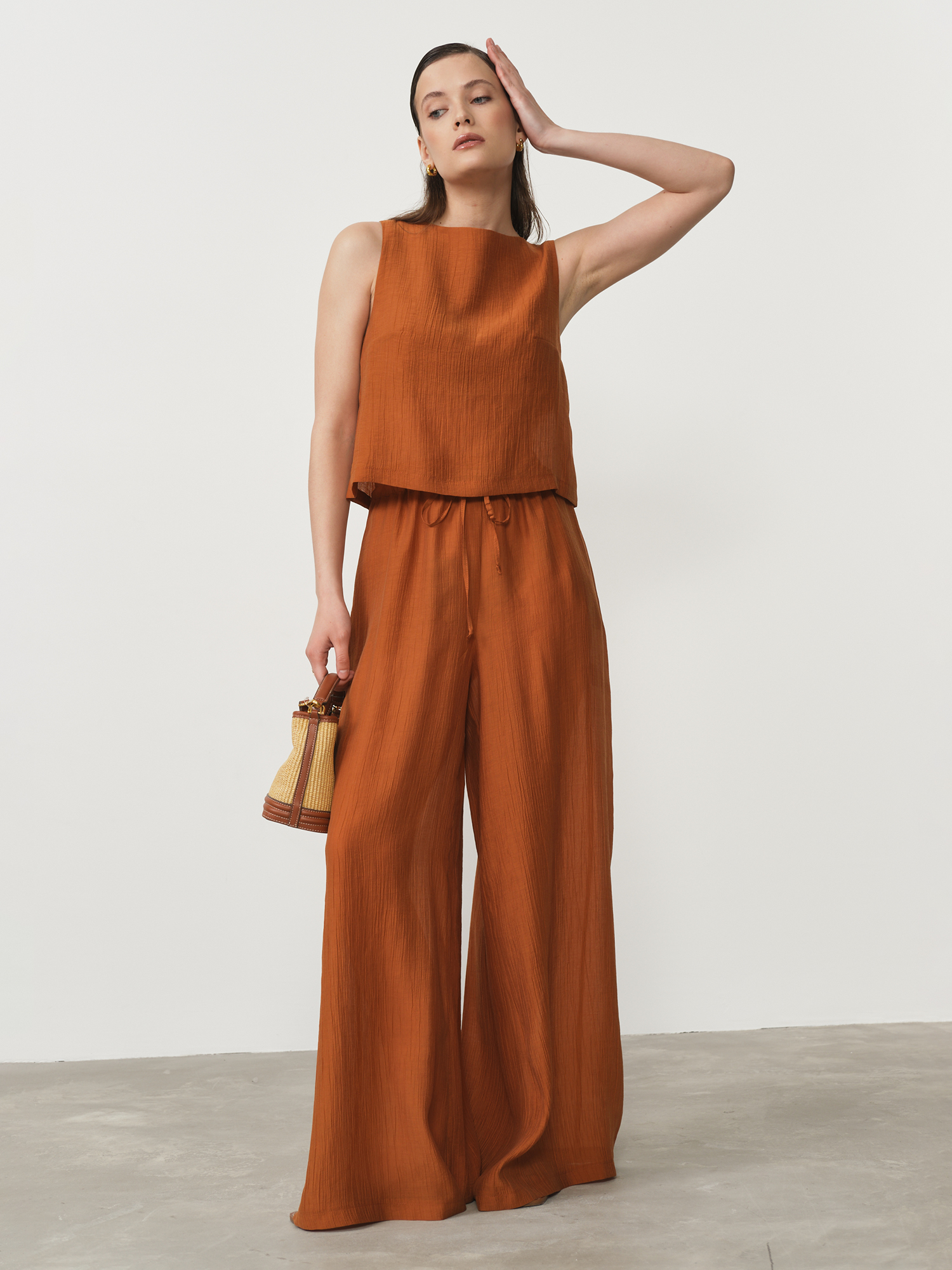 Терракот — тёплый насыщенный оттенок, добавляющий образу глубину и выразительность.