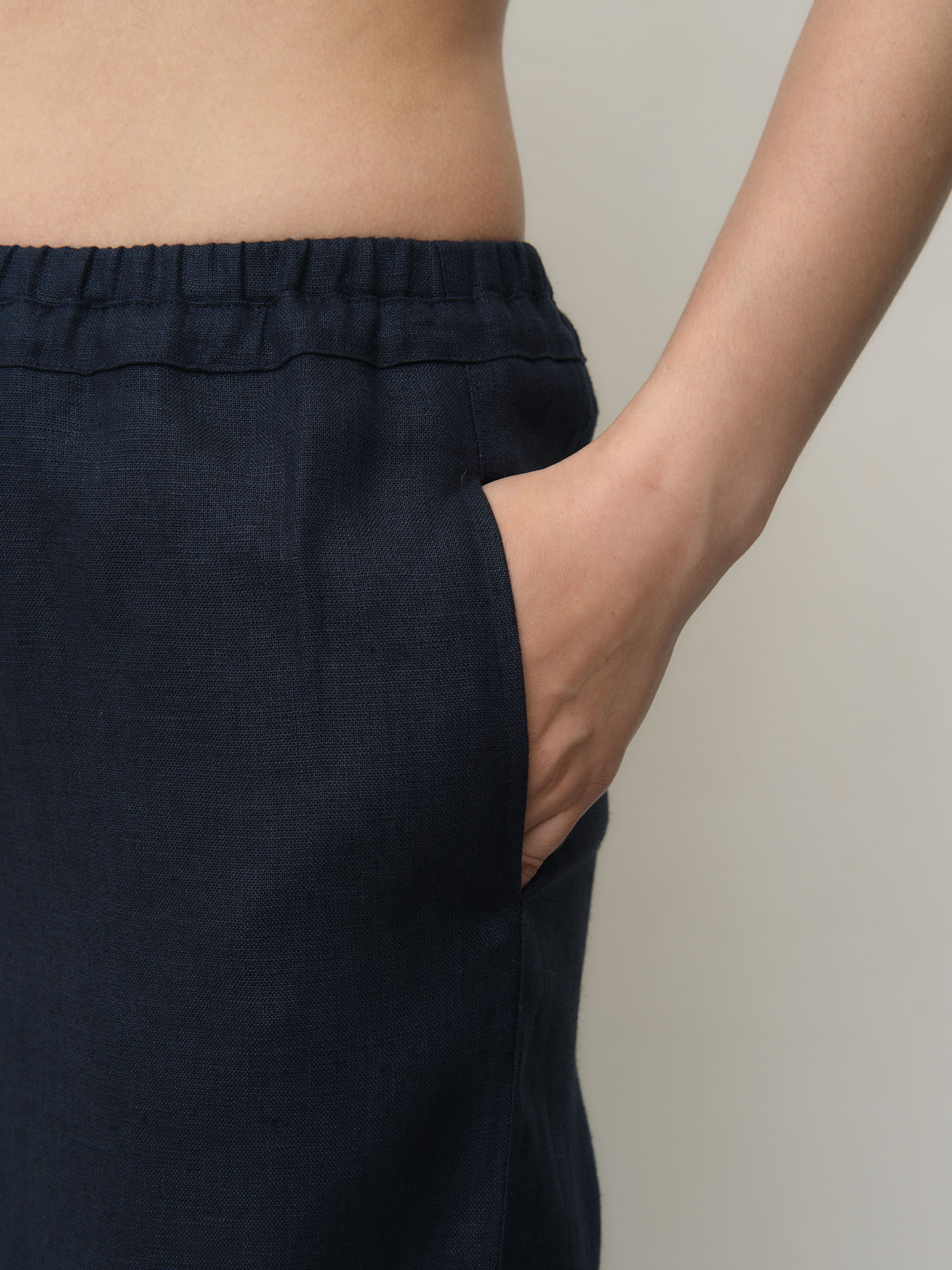 Эластичный пояс для комфортной посадки, боковые карманы, аккуратные швы, легкая текстура ткани.