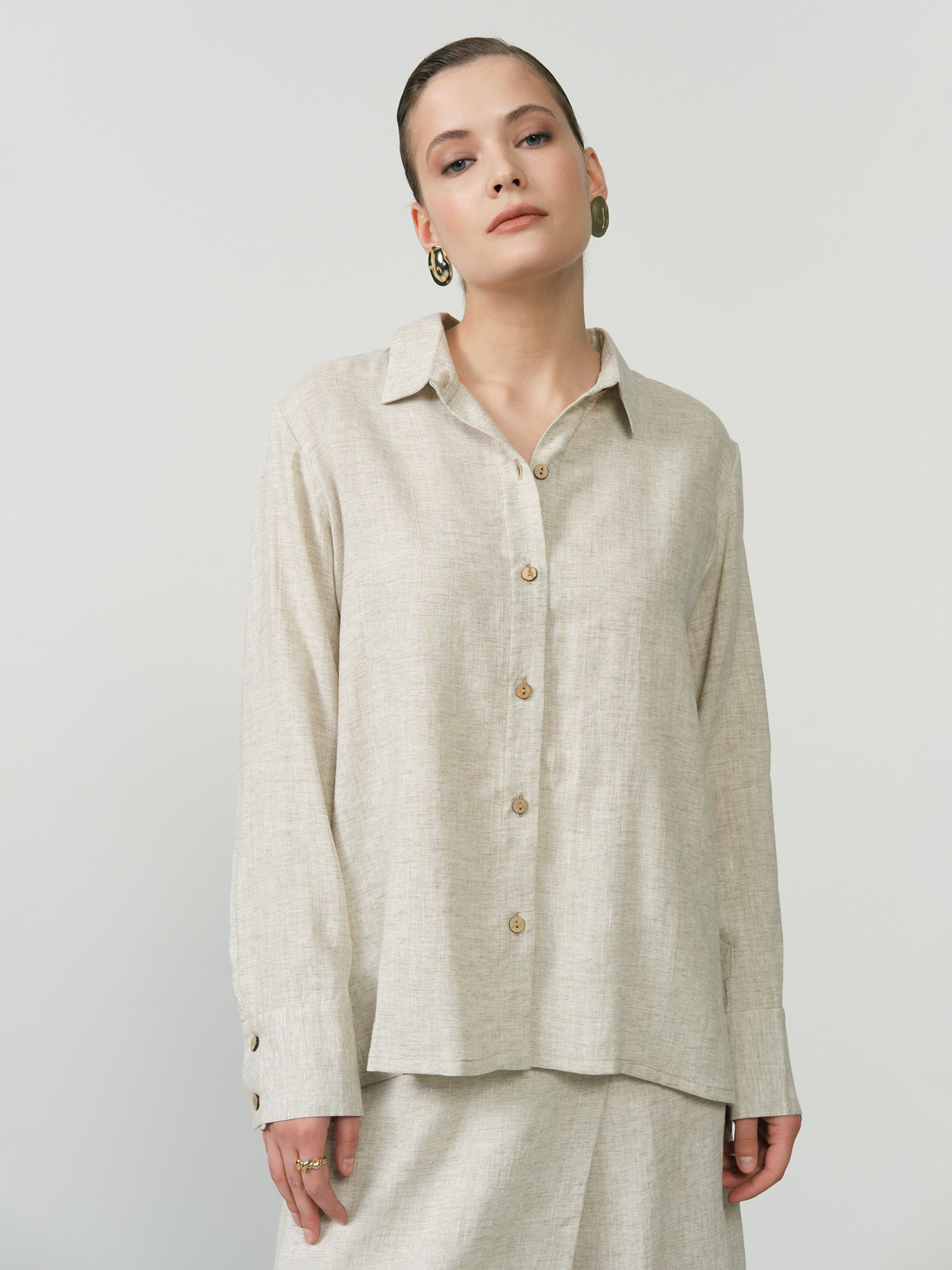 Застёжка на пуговицы, длинные рукава с манжетами, аккуратная линия плеч, мягкая фактура ткани, ровные швы.
