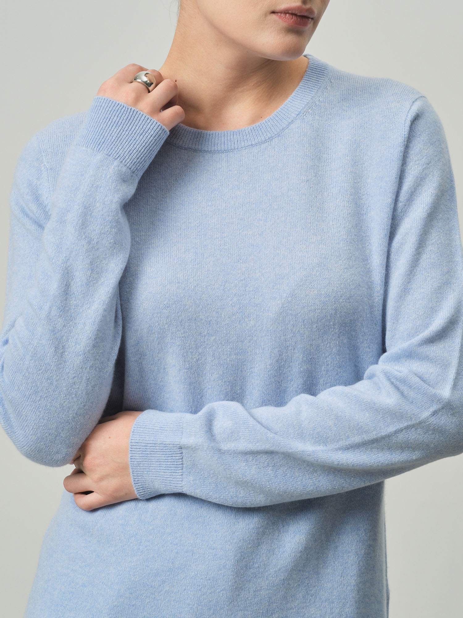 Модель выполнена с классическим круглым вырезом и гладкой вязкой. Чистые линии и минималистичный силуэт подчёркивают благородную фактуру кашемира и делают изделие универсальным.