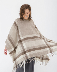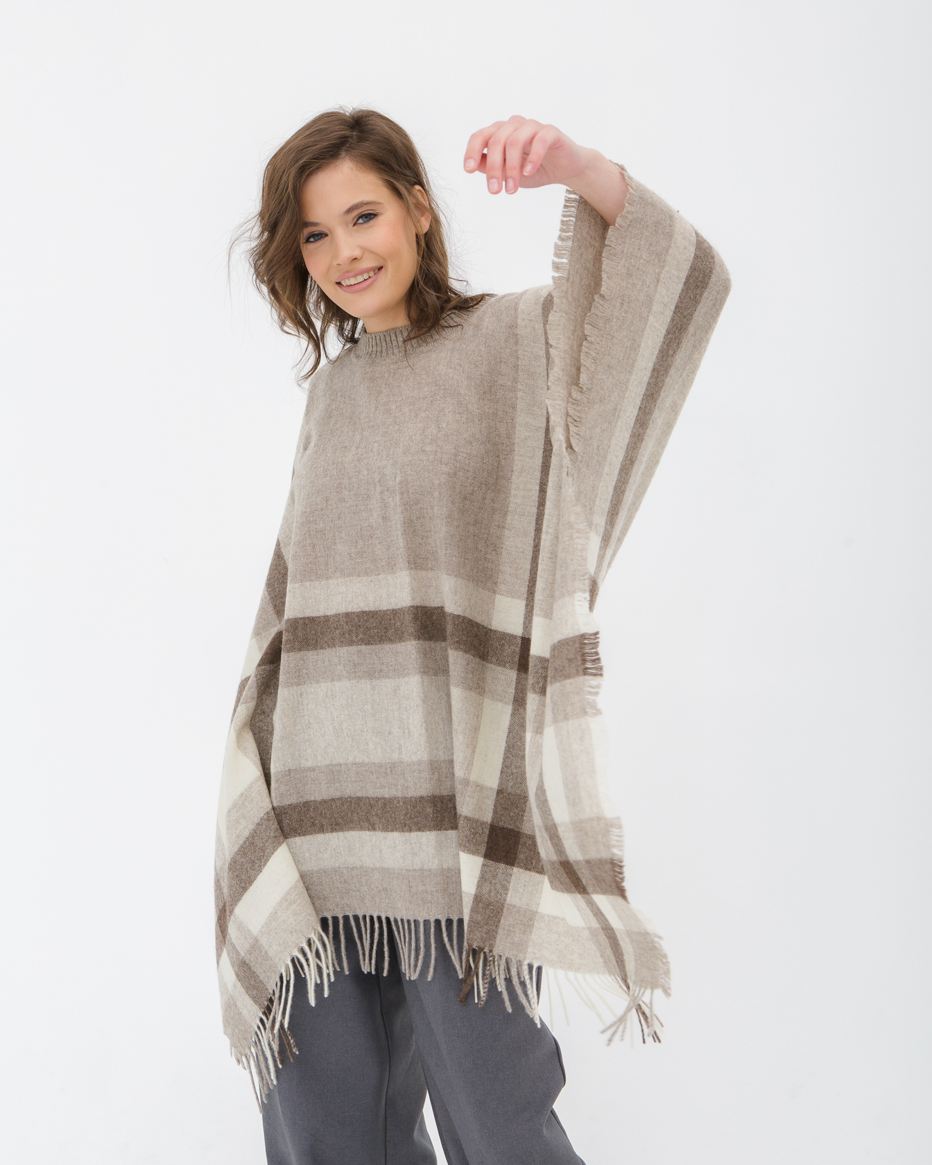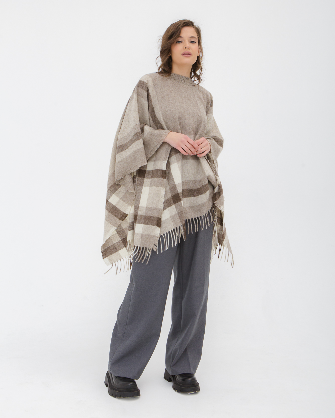 Формат пончо с широким кроем, декоративная клетка и аккуратная бахрома по краю создают эффектный и современный образ.