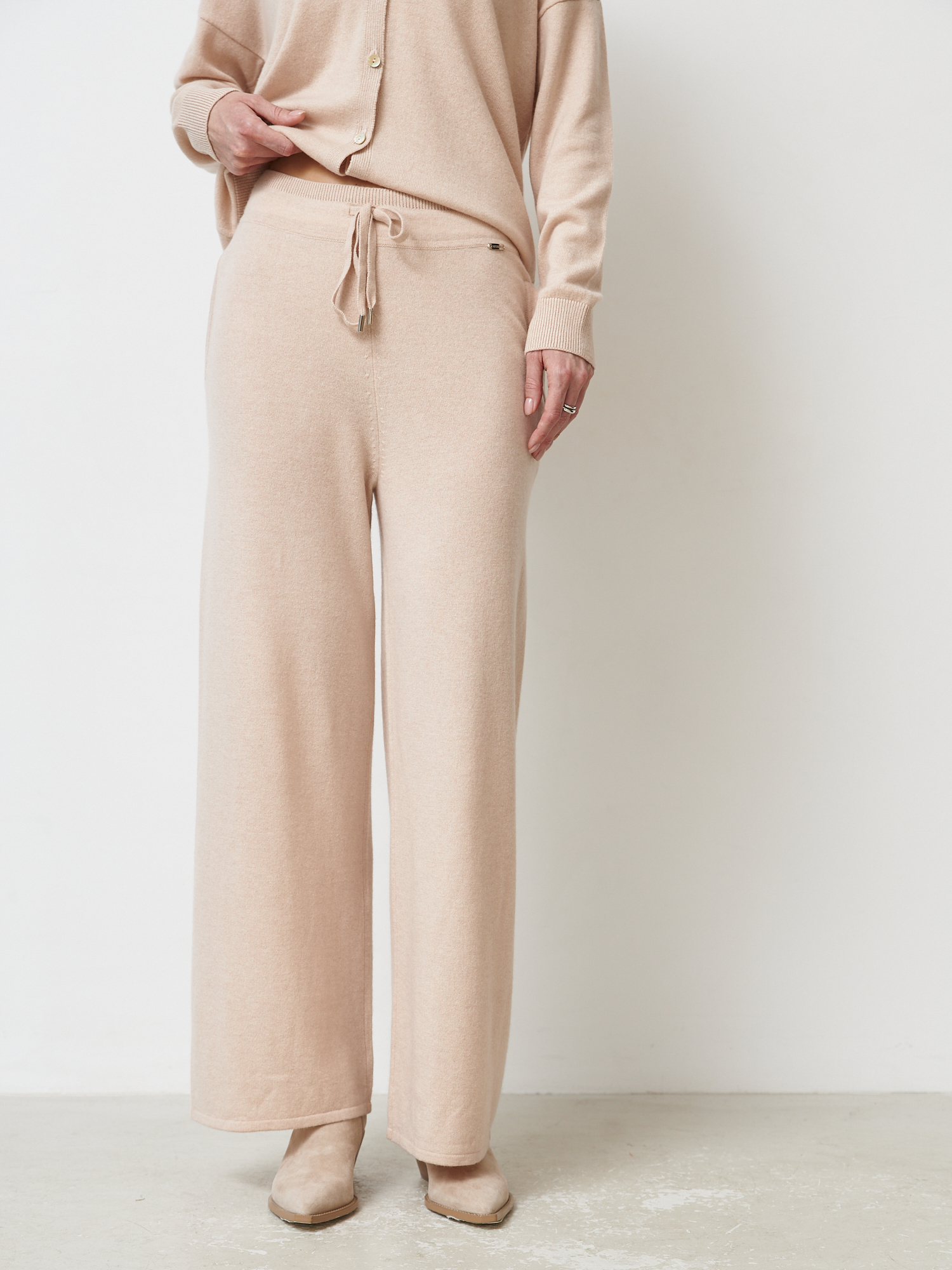 Отлично смотрятся в комплекте с кашемировыми кардиганами, свитерами и топами из той же коллекции, а также с базовой обувью в нейтральных оттенках.